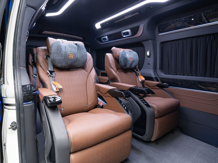 进入车内,车内配备 12.3 英寸中控触控屏与 38 英寸后排超大娱乐屏,支持语音交互、手机互联等功能,语音助手识别准确率超 98%,可轻松控制空调、音乐等设备。细节处尽显匠心,中控台、门板采用定制化实木饰板,搭配手工缝线工艺,座椅之间配备可升降式中央隔断,集成车载冰箱、无线充电板与储物格,提供 7 座(2+2+3),二排航空座椅可旋转180°,与三排形成对坐模式,搭配可拆卸式小桌板和掼蛋套装,轻松实现会议、娱乐等多种场景的切换。